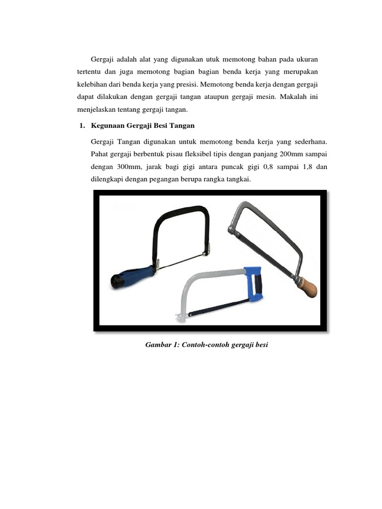 Bahagian 2 dari 2. Mereka dibahagikan kepada alat logam dan kayu. Semasa memotong daya memotong diperlukan semasa menyorong gergaji kehadapan.