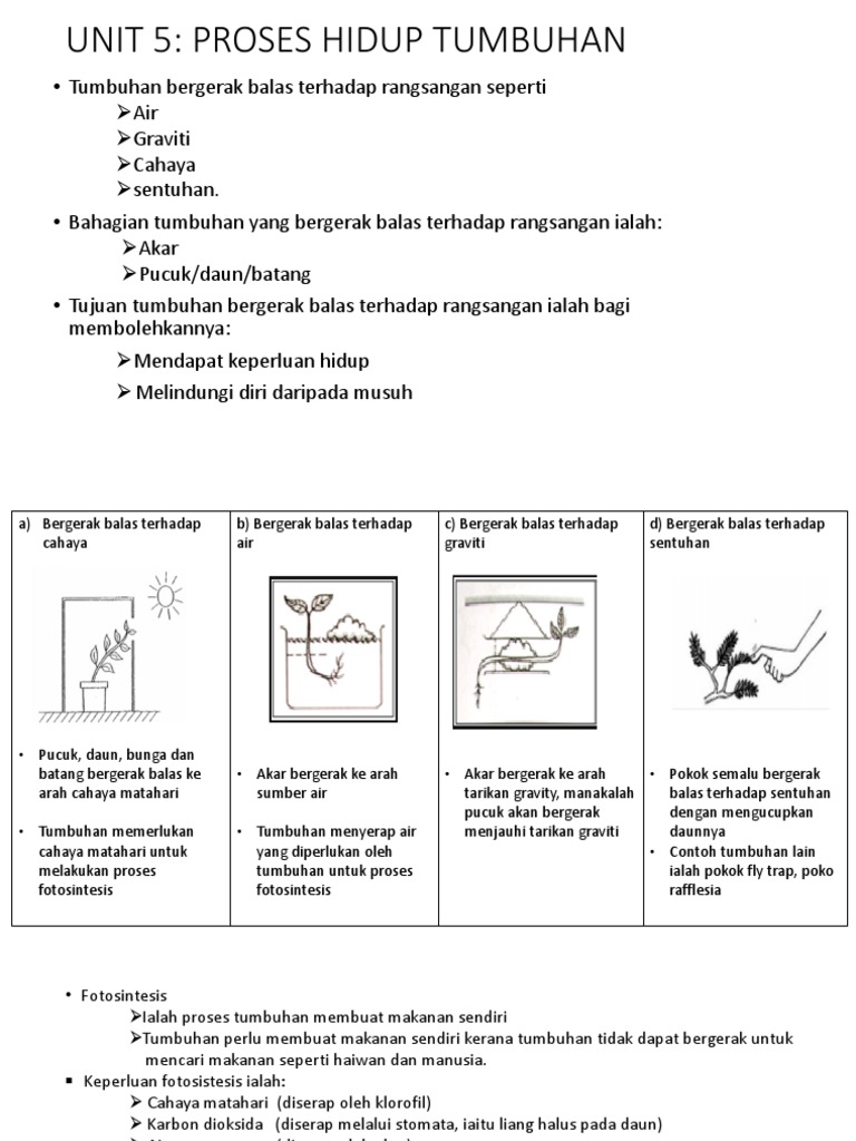 Nota sains tahun 4 unit 5. Tumbuhan bergerak balas terhadap rangsangan seperti cahaya matahari air graviti dan sentuhanHanya bahagian tumbuhan yang tertentu seperti pucuk daun dan akar boleh bergerak balas terhadap rangsangan. Tumbuh-tumbuhan bergerak balas terhadap rangsangan seperti air graviti cahaya dan sentuhan bahagian tumbuhan gerak balas akar tumbuh ke arah air dan tarikan graviti pucuk tumbuh ke arah cahaya daun sesetengah tumbuhan yang bergerak balas terhadap sentuhan contoh.