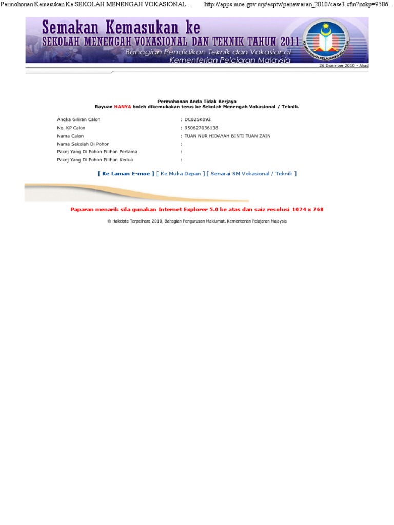 Semakan Tawaran Ke Kolej Vokasional Sm Teknik Dan Sm Vokasional Tahun 2012 Ciklaili
