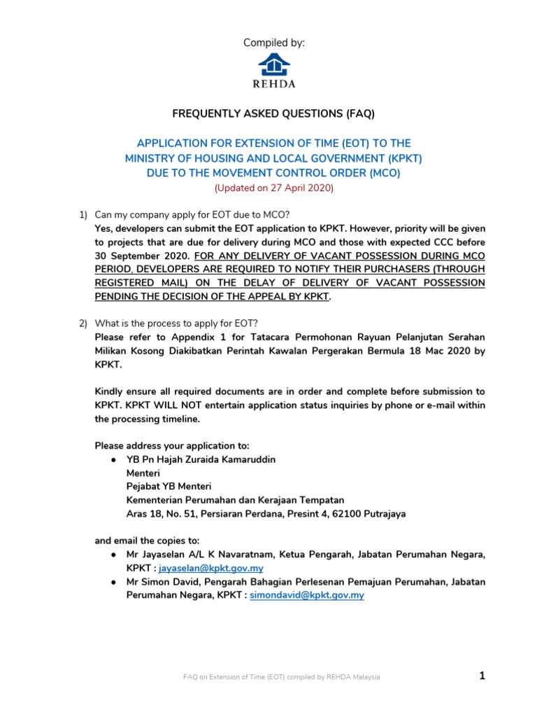 Application For Extension Of Time Eot To The Ministry Of Housing And Local Government Kpkt Due To The Movement Control Order Mco Government Information Government