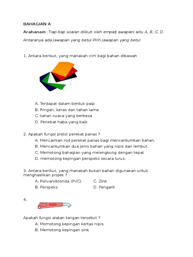 BAHAGIAN A60 markah Bahagian ini mempunyai 30 soalan. Apakah kelebihan menggunakan alat di dalam Rajah 2 di atas. Pemutar skru philips - Mengetatkan dan melonggarkan skru mata philips Pistol perekat panas - Untuk mencairkan rod perekat panas semasa proses mengglu Pistol pengokot - Untuk mencantum kepingan bahan yang nipis dan lembut seperti papan lapis dan mounting board Pahat - Untuk memahat meraut dan.