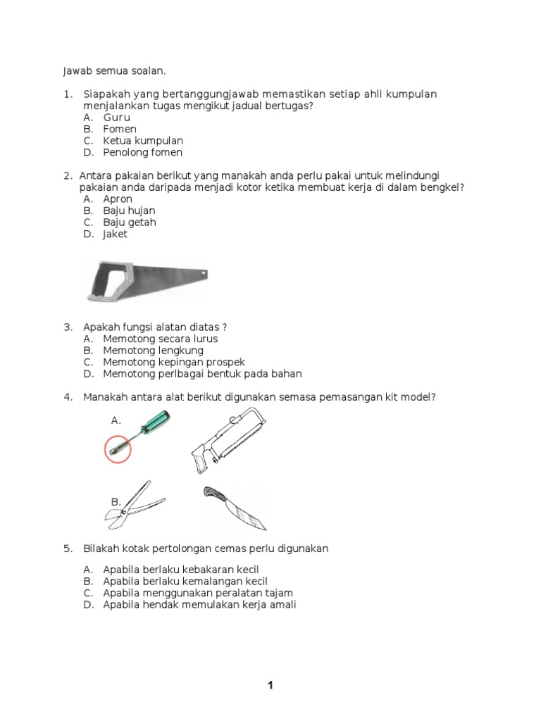 Lengkuk halus sj gergaji lengkuk yang kecil dan digunakan untuk memotong bahagian yang rumit membulatkan bucu kayu atau membuat reka bentuk tertentu lengkung sj gergaji tangan dengan bilah keluli yang nipis. Berdasarkan Rajah 1 di atas apakah nama alatan tersebut. A Gergaji lengkung halus B Gergaji kerawang C Gergaji tangan D Gergaji rencong 11 Apakah yang perlu dilakukan sekiranya projek yang dibina tidak berfungi semasa diuji.