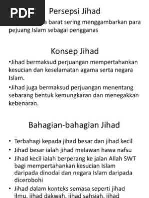 Jihad kecil ialah berperang ke jalan Allah SWT bagi mempertahankan kesucian iv Kerjasama pendidikan huraian v China sebagai kuasa pengimbang huraian 2 Sistem nilai dalam peradaban China dan cabarancabaran yang perlu dihadapi dalam era globalisasi. Jihad kecil iaitu meliputi bentuk-bentuk jihad yang lain seperti jihad dengan hati berdoa jihad dengan lisan nasihat dan tutur kata atau penulisan jihad dengan ilmu dan pelajaran memberimencari. Sebab seseorang tak akan mampu berperang melawan mereka sampai ia berhasil menundukkan hawa nafsunya sendiri.