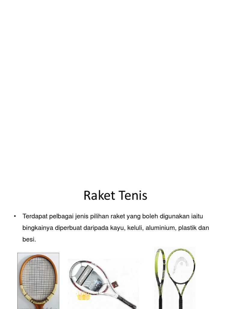 10 PENGENALAN Tenis merupakan salah satu pemainan menggunakan raket yang disukai oleh sebahagian besar penduduk dunia. Membantu menjatuhkan pukulan yang lebih kuat ke gelanggang lawan dengan meningkatkan geseran antara bahagian atas bola dan udara sehingga menjadikan udara mendorong ke bawah ke atas bola. Ia merupakan sukan raket yang tertua berbanding sukan squash dan beberapa sukan raket yang lain.