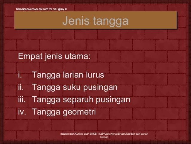 View tangga-160316034137docx from AA 1TANGGA TANGG PENGENALAN Tanga merupakan salah satu binaan penting dalam sesebuah pembinaan bangunan. Ketinggian dari langkah pertama ke tumpang tindih 10 cm lebih tinggi dari ketinggian anggota keluarga tertinggi. Tangga larian lurus merupakan satu deretan anak tangga yang menghubungkan dari satu tingkat ke tingkat yang lain dalam satu arah.