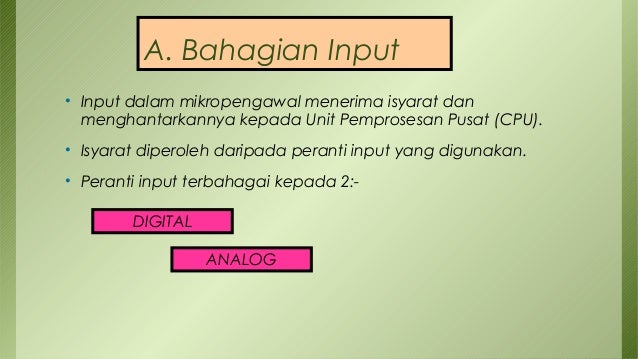 Bahagian Input Input dalam mikropengawal menerima isyarat dan menghantarkannya kepada Unit Pemprosesan Pusat CPU. Bagian-bagian Osiloskop Kontrol dan Indikator Osiloskop Osiloskop merupakan salah satu alat ukur yang sangat bermanfaat dalam menguji dan mengukur suatu rangkaian Elektronika. Bahagian-bahagian yang terdapat dalam Mikropengawal Microcontroller Gambar rajah jelas menunjukkan hubung kait antara 3 bahagian di dalam mikropengawal iaitu Input Proses dan Output.