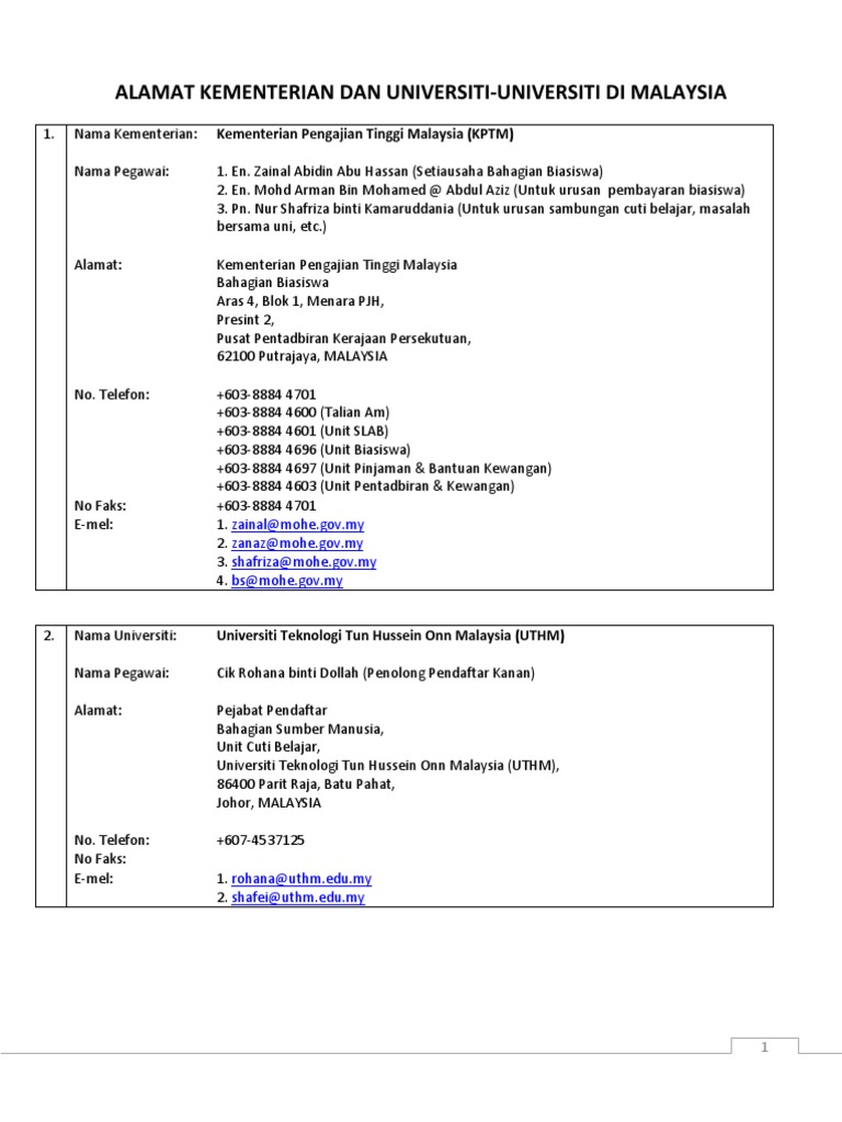 Alamat Kementerian Dan Universiti Universiti Di Malaysia