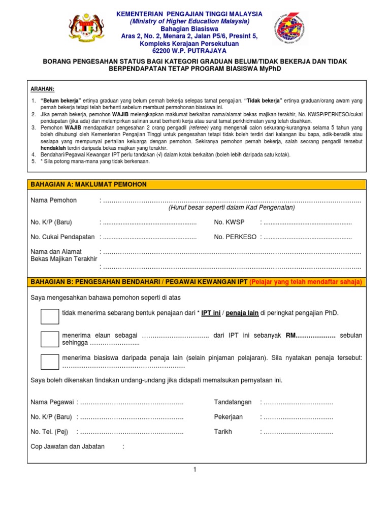 Bahagian Biasiswa Kementerian Pengajian Tinggi Malaysia SULIT Borang ini hendaklah dihantar terus oleh pihak majikan kepada Bahagian Biasiswa Kementerian Pengajian Tinggi sebelum pegawai memulakan pengajian ke alamat berikut. Pelajar tidak perlu menghantar dokumen dan Salinan dokumen ke Bahagian ini. National Higher Education Fund Cooperation Fund Type.