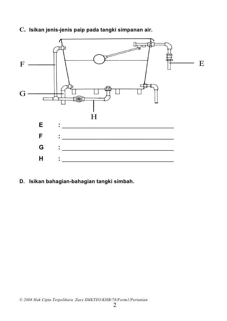 Yang paling biasa digunakan untuk tujuan tangki diafragma tertutup ini. 1235 mm 49 inci Tinggi H1. Sistem Tidak Terustidak langsung Bekalan air dibekalkan dari meter air melalui paip perkhidmatan ke tangki simpanan air Tangki simpanan air Paip agihan Paip cuci Paip limpah Paip perkhidmatan Paip agihan Berfungsi membekalkan air ke pelbagai kelengkapan perpaipan dalam rumah seperti tandas bilik mandi dan pili paip.
